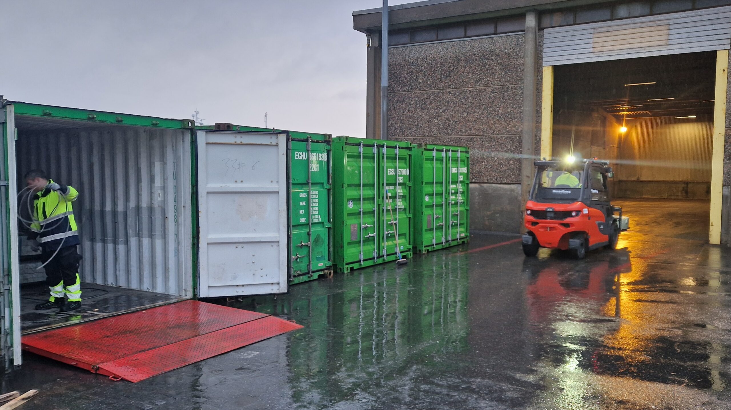 I containeren er Albert Almen. I trucken ser du Stig Landgren. På bildet med lageret i bakgrunnen, er ingen ringere enn Jon-Arne Myhre og Knut Olsen.